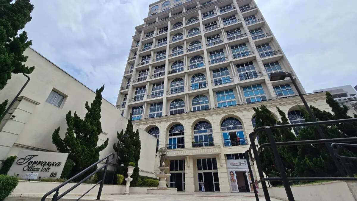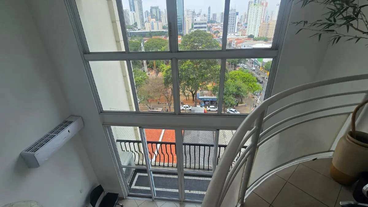 Sala comercial duplex de 78m², com pé-direito duplo e vista panorâmica para as copas das árvores da Praça Silvio Romero.